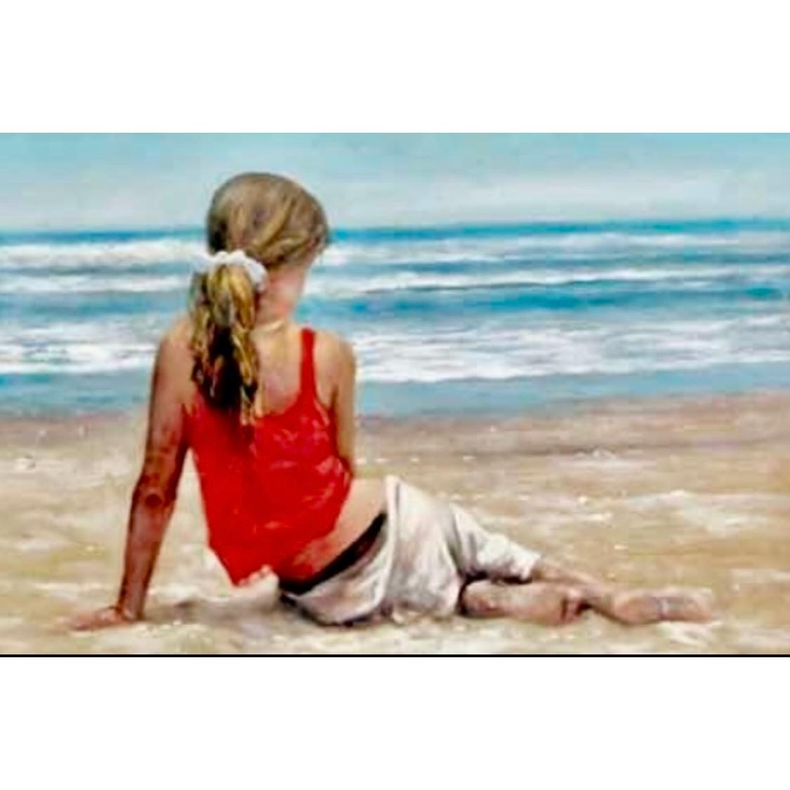 El contraste entre la vestimenta vibrante y los tonos suaves del mar genera una composición armónica y emocional, ideal para quienes buscan piezas artísticas que inspiran paz y conexión interior. Esta obra es una excelente elección para espacios modernos, costeros o minimalistas, y resulta perfecta para coleccionistas de Arte chileno contemporáneo.