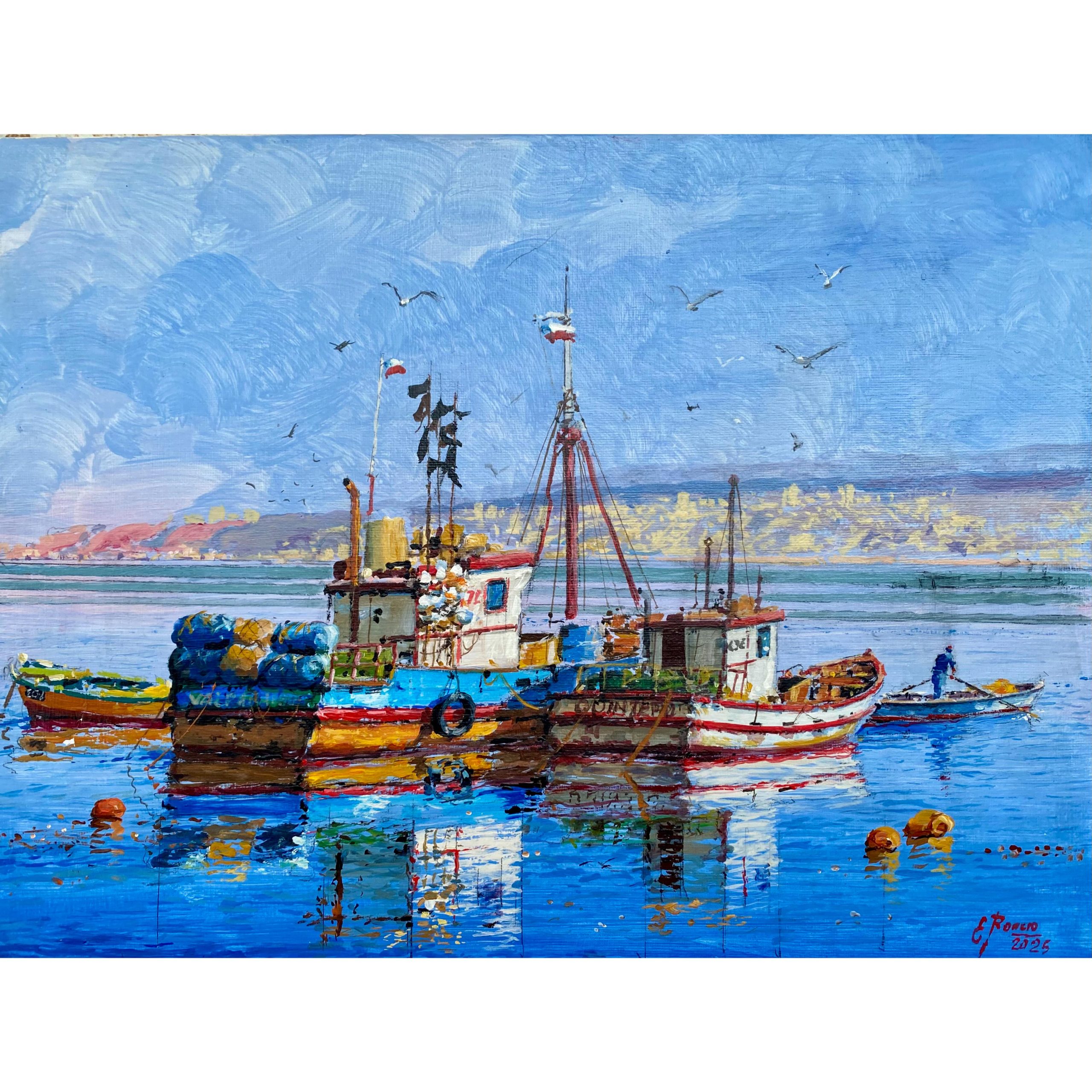 Descubre Velas en Angelmó, un óleo sobre tela de Ernesto Romero que captura la esencia del puerto con la maestría de la pintura clásica chilena.
