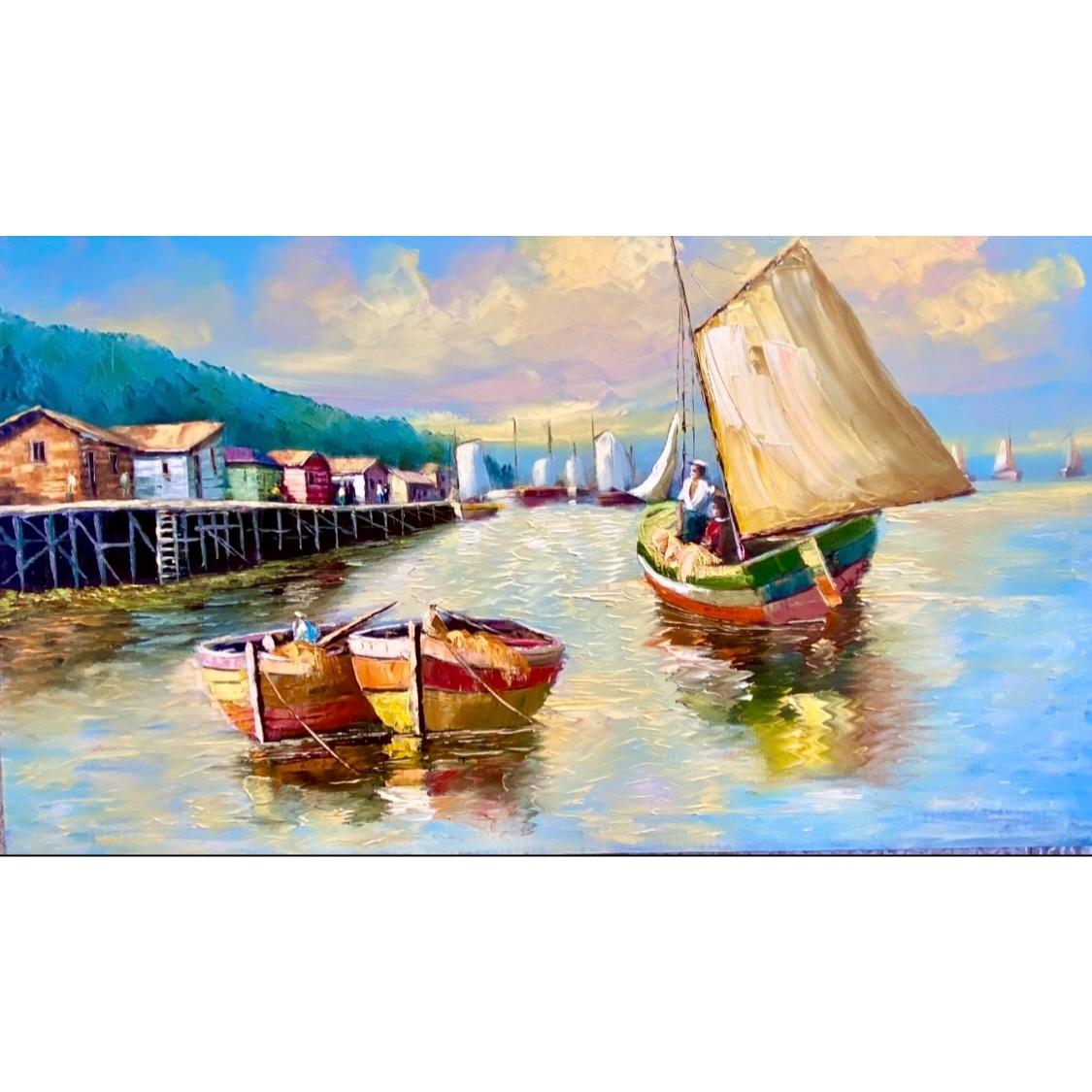Esta hermosa pintura al óleo de 80 x 120 cm, realizada por el talentoso artista Garetti, transporta al espectador a la mágica isla de Chiloé, donde los tradicionales palafitos de madera se alinean a orillas del mar. La escena cobra vida con la luz dorada del atardecer reflejándose en el agua, mientras varias embarcaciones de vela navegan suavemente por la bahía, capturando la esencia de la vida costera del sur de Chile.