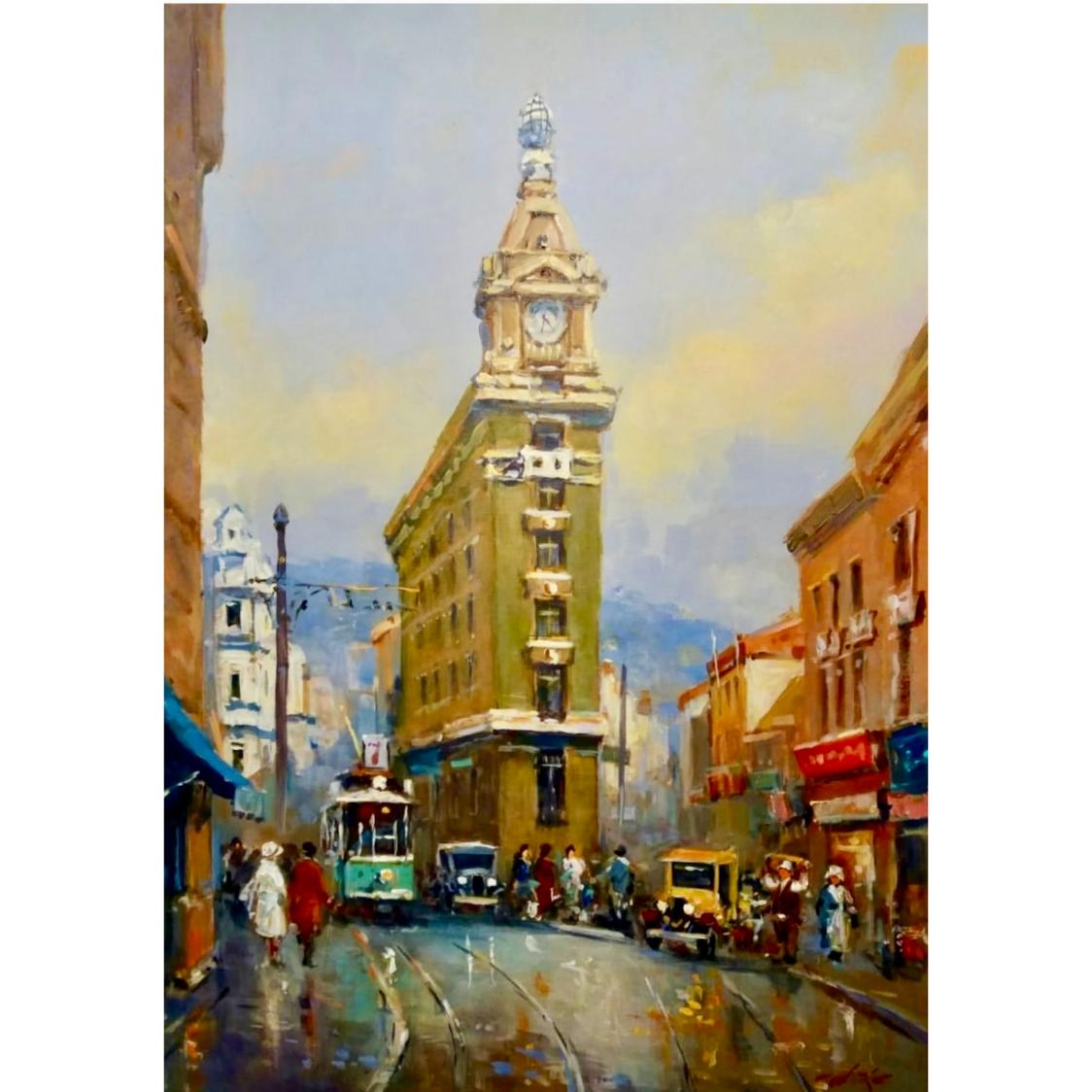 Con una paleta de tonos cálidos y vibrantes, el artista nos transporta a la Valparaíso de antaño, donde los tranvías recorren sus calles y la arquitectura clásica resplandece bajo la luz del día. La perspectiva dinámica y los reflejos en la calzada mojada evocan la atmósfera única de la ciudad, llena de historia, cultura y movimiento.