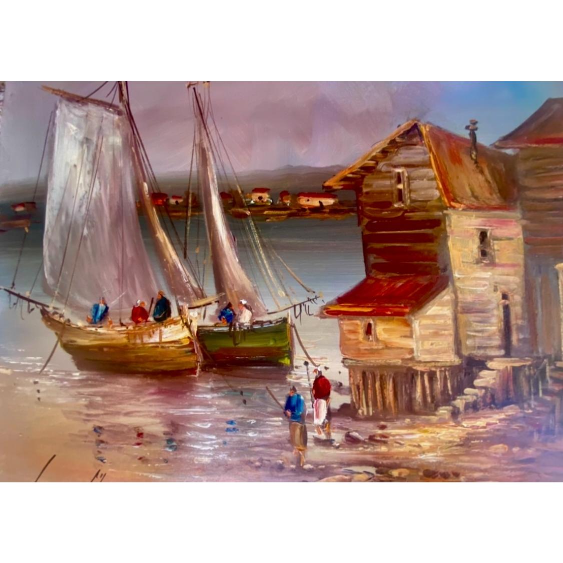 El uso de tonos cálidos y violáceos transmite un ambiente de atardecer, donde el mar refleja la luz del cielo y los pescadores se preparan en calma. El trazo suelto y expresivo del óleo aporta movimiento y vitalidad, fusionando tradición y arte contemporáneo.