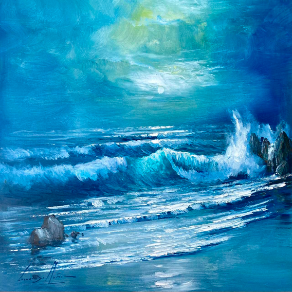 Obra original del destacado artista chileno Leonardo Muñoz. Esta pieza nos transporta a un paisaje marino en tonos azules profundos, donde las olas rompen con fuerza sobre la orilla bajo un cielo dramático. La pincelada expresiva del autor captura el movimiento del agua y la energía del océano con gran realismo y sensibilidad.
