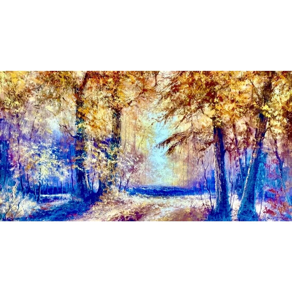 Obra del destacado pintor chileno Roberto Mora, este cuadro al óleo de 60 x 90 cm destaca por su uso audaz del color y su atmósfera mágica de otoño. Una explosión de tonos dorados, rojizos, púrpuras y azules baña un bosque lleno de luz y profundidad, invitando al espectador a perderse en un sendero encantado.